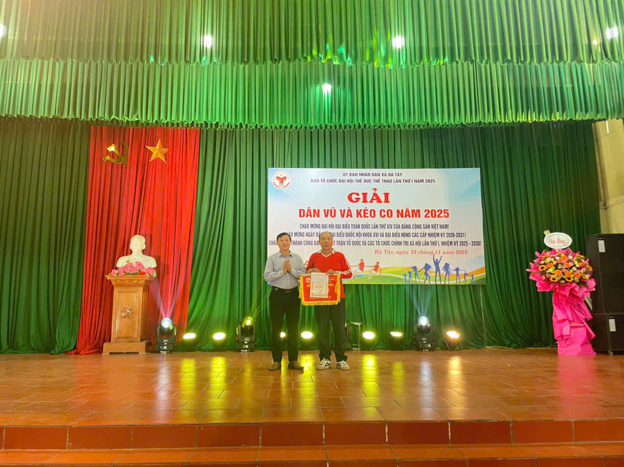 Đồng chí Nguyễn Quang Ngọc - Phó Chủ tịch UBND xã và đồng chí Nguyễn Danh Trịnh - Trưởng phòng Văn hóa - Xã hội trao cờ lưu niệm cho các đội tham gia giải Dân vũ