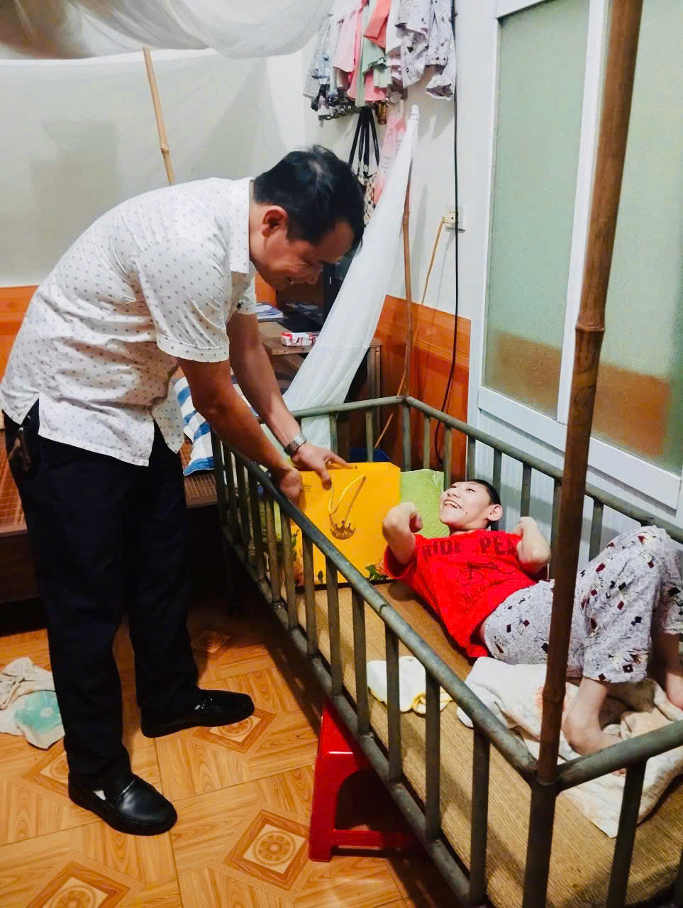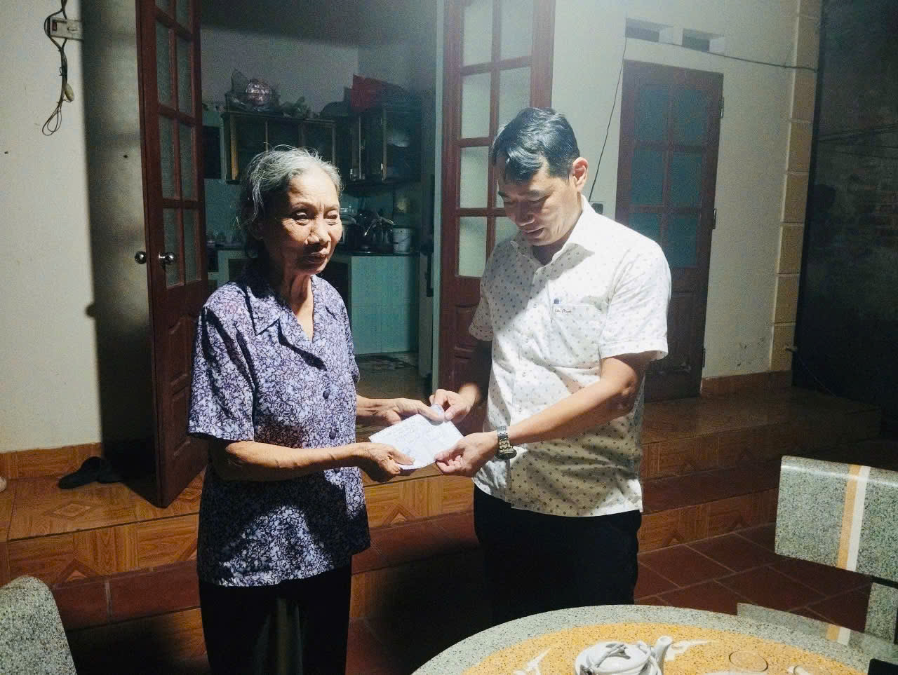 Đồng chí Phó Bí thư Thường trực Đảng uỷ đã ân cần thăm hỏi tình hình sức khỏe của hai cháu, trao tặng một phần quà của Đảng uỷ - HĐND - UBND xã cho con gái thứ hai của gia đình anh Hồng. Đồng thời, đồng chí cũng thay mặt ông Phạm Văn Toản, xóm 1, thôn Đông Phan, xã Hà Tây hiện đang công tác tại Thành phố Hồ Chí Minh trao tặng cháu Nguyễn Bình Minh- con trai của anh Hồng số tiền 3.000.000 đồng.